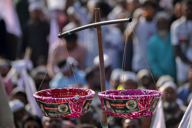 Sylhet, Bangladesh- Suppors with Electoral symbol: scales and pestoons,playcards, flags in the pre election rally. Bangladesh Jamaat-e-Islami Ameer DR SHAFIQUR RAHMAN addresses supporters during the 11-party alliance national election campaign rally at the at the historic Sylhet Government Alia Madrasa ground in Sylhet on February 7, and outlining his plans and vision to voters. Thousands of party leaders and supporters from across the Sylhet division attended the rally, including a significant number of women and children., Credit:Md Rafayat Haque Khan / Avalon