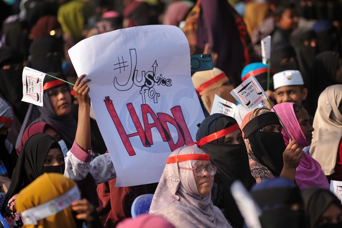 Sylhet, Bangladesh- Suppors with Electoral symbol: scales and pestoons,playcards, flags in the pre election rally. Bangladesh Jamaat-e-Islami Ameer DR SHAFIQUR RAHMAN addresses supporters during the 11-party alliance national election campaign rally at the at the historic Sylhet Government Alia Madrasa ground in Sylhet on February 7, and outlining his plans and vision to voters. Thousands of party leaders and supporters from across the Sylhet division attended the rally, including a significant number of women and children., Credit:Md Rafayat Haque Khan / Avalon