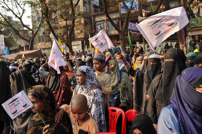 Sylhet, Bangladesh- Suppors with Electoral symbol: scales and pestoons,playcards, flags in the pre election rally. Bangladesh Jamaat-e-Islami Ameer DR SHAFIQUR RAHMAN addresses supporters during the 11-party alliance national election campaign rally at the at the historic Sylhet Government Alia Madrasa ground in Sylhet on February 7, and outlining his plans and vision to voters. Thousands of party leaders and supporters from across the Sylhet division attended the rally, including a significant number of women and children., Credit:Md Rafayat Haque Khan / Avalon