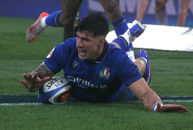 7/2/2026 Roma,Guinness M 6 Nations, Italia vs Scozia,nella foto Tommaso Menoncello va in meta, Credit:MASSIMO LOVATI / Avalon