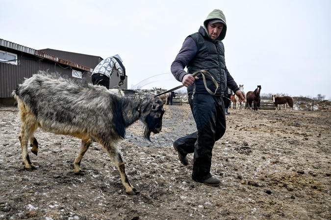 A man leads one of the nine goats evacuated by volunteers from the front-line town of Orikhiv in the southeastern Zaporizhzhia region by the lead at the Pehas animal shelter, Dnipropetrovsk region, Ukraine, February 6, 2026., Credit:Dmytro Smolienko / Avalon