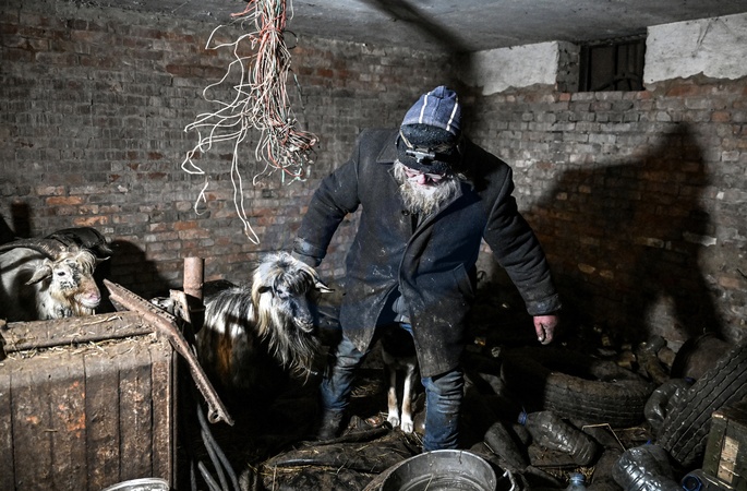 Local Viktor Zinchenko, who keeps goats in the basement to protect them from Russian shelling, hands over goats to volunteers, Orikhiv, Zaporizhzhia region, Ukraine, February 6, 2026. Volunteers are set to evacuate nine goats from the front-line town of Orikhiv in the southeastern Zaporizhzhia region to the Pehas animal shelter in the Dnipropetrovsk region., Credit:Dmytro Smolienko / Avalon