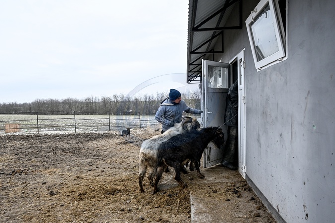 A man brings goats evacuated by volunteers from the front-line town of Orikhiv in the southeastern Zaporizhzhia region to an enclosure at the Pehas animal shelter, Dnipropetrovsk region, Ukraine, February 6, 2026., Credit:Dmytro Smolienko / Avalon