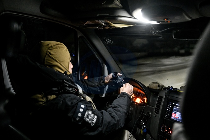 A volunteer adjusts a night-vision device and attaches it to a phone en route to Orikhiv, Zaporizhzhia region, Ukraine, February 6, 2026. Volunteers are set to evacuate nine goats from the front-line town of Orikhiv in the southeastern Zaporizhzhia region to the Pehas animal shelter in the Dnipropetrovsk region., Credit:Dmytro Smolienko / Avalon