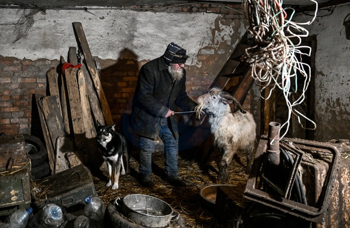 Local Viktor Zinchenko keeps goats in the basement to protect them from Russian shelling in the front-line town of Orikhiv in the southeastern Zaporizhzhia region, Ukraine, February 6, 2026. Volunteers are set to evacuate nine goats to the Pehas animal shelter in the Dnipropetrovsk region., Credit:Dmytro Smolienko / Avalon