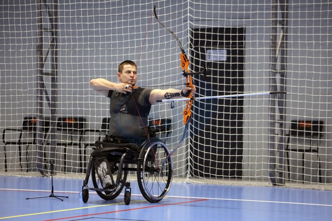 Artem Peredereiev, a member of the national veteran team, practises archery during the training camp in preparation for the 2026 Marine Corps & Air Force Trials (MC&AF Trials), to be held February 20–March 3, 2026, at Camp Pendleton, California, Kyiv, February 6, 2026. The team's preparation, training, and participation are organised by the Ministry of Veterans Affairs of Ukraine together with the CBA Initiatives Center, within the framework of the Veteran Policy Strategy and the National Strategy for Creating a Barrier-Free Space in Ukraine, developed at the initiative of First Lady Olena Zelenska., Credit:Yuliia Ovsiannikova / Avalon