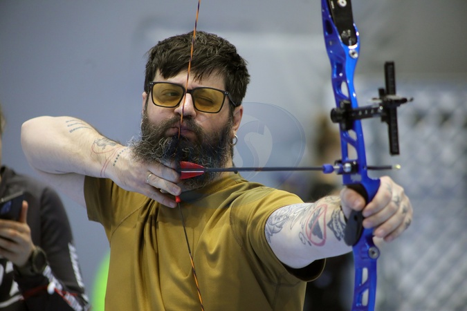 A member of the national veteran team practises archery during the training camp in preparation for the 2026 Marine Corps & Air Force Trials (MC&AF Trials), to be held February 20–March 3, 2026, at Camp Pendleton, California, Kyiv, February 6, 2026. The team's preparation, training, and participation are organised by the Ministry of Veterans Affairs of Ukraine together with the CBA Initiatives Center, within the framework of the Veteran Policy Strategy and the National Strategy for Creating a Barrier-Free Space in Ukraine, developed at the initiative of First Lady Olena Zelenska., Credit:Yuliia Ovsiannikova / Avalon