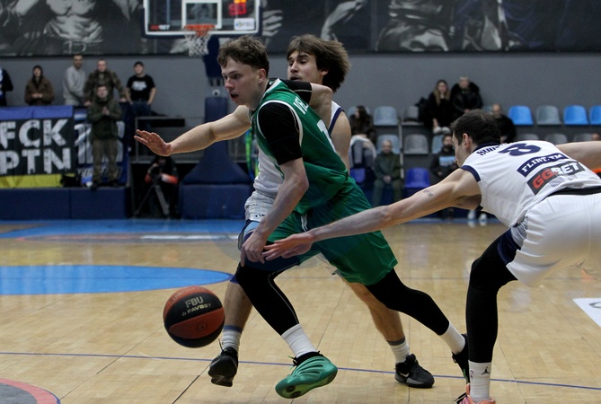 Guard Andrii Velychko (C) of BC Zaporizhzhia is in action with players of BC Dnipro during the 2025/2026 Ukrainian Basketball SuperLeague Regular Season Round 14 match at the Shynnyk Culture and Sports Complex in Dnipro, Ukraine, February 7, 2026. The Dnipro-based team has claimed a 98-68 win over the squad from Zaporizhzhia., Credit:Mykola Miakshykov / Avalon