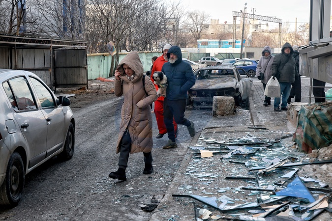 People cross a street covered with shattered glass after an overnight Russian drone strike, Odesa, Ukraine, February 9, 2026. On the night of February 9, the Russian army carried out a massive drone attack on Odesa and the region, hitting residential areas. One person was killed and two others were injured., Credit:Nina Liashonok / Avalon