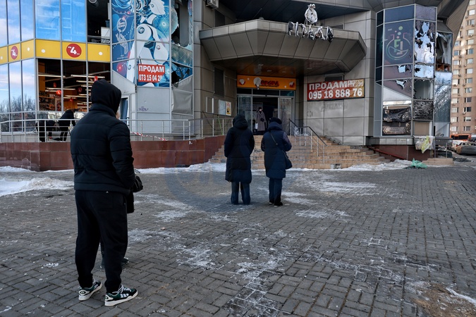 People stand outside a shopping mall damaged by an overnight Russian drone strike, Odesa, Ukraine, February 9, 2026. On the night of February 9, the Russian army carried out a massive drone attack on Odesa and the region, hitting residential areas. One person was killed and two others were injured., Credit:Nina Liashonok / Avalon