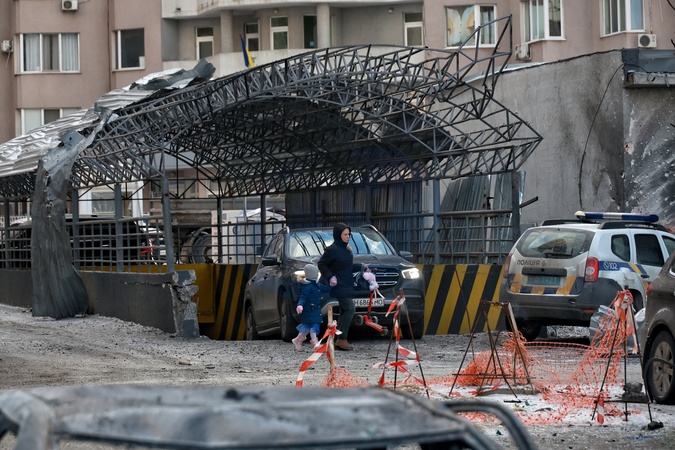 A woman and a child emerge from an underground parking lot damaged by an overnight Russian drone strike, Odesa, Ukraine, February 9, 2026. On the night of February 9, the Russian army carried out a massive drone attack on Odesa and the region, hitting residential areas. One person was killed and two others were injured., Credit:Nina Liashonok / Avalon