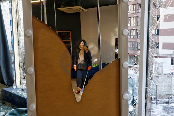 A smiling woman cleaning a room after an overnight Russian drone strike is reflected in the mirror, Odesa, Ukraine, February 9, 2026. On the night of February 9, the Russian army carried out a massive drone attack on Odesa and the region, hitting residential areas. One person was killed and two others were injured., Credit:Nina Liashonok / Avalon