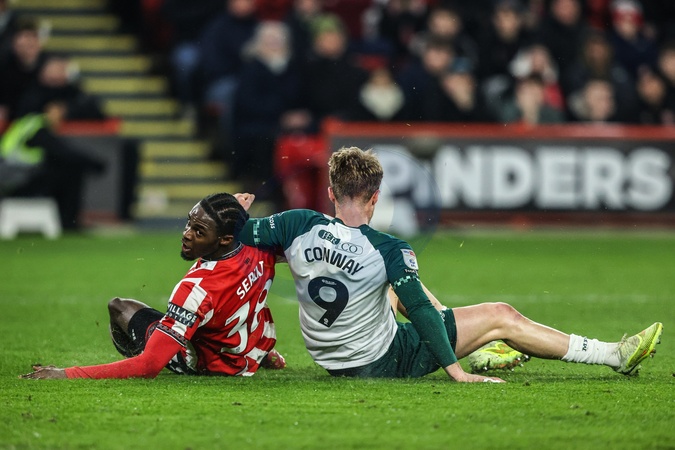 Tommy Conway of Middlesbrough scores to make it 0-1 after a collision with Femi Seriki of Sheffield United deflects the ball into the net during the Sky Bet Championship match Sheffield United vs Middlesbrough at Bramall Lane, Sheffield, United Kingdom on 09 February 2026, Credit:Ae Cosgrove/News Images / Avalon