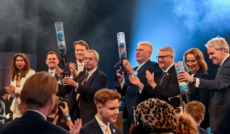 Reform UK, Suella Braverman, Robert Jenrick, Richard Tice, Nigel Farage, Lee Anderson, Andrew Rosindell, Sarah Pochin and Danny Kruger, left to right, following a speech by Nigel Farage, leader of Reform UK, at the National Exhibition Centre (NEC) in Birmingham, UK, on Monday, Feb. 9, 2026.at a Reform UK rally and speech by Nigel Farage, Credit:Jules Annan / Avalon