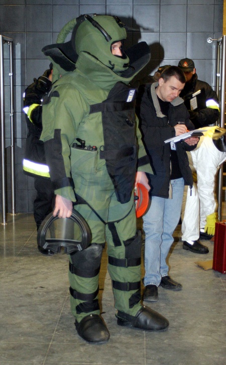 Stacja metra Dworzec Gdanski. Cwiczenia sluzb ratowniczych, policji, strazy pozarnej, pirotechnikow. Podczas cwiczen symulowano rozbrojenie bomby podlozonej przez terrorystow na stacji metra .
