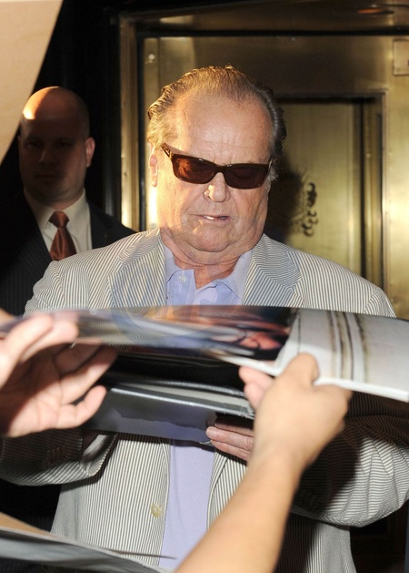 Jack Nicholson rozdaje autografy wychodzac z hotelu w Nowym Jorku