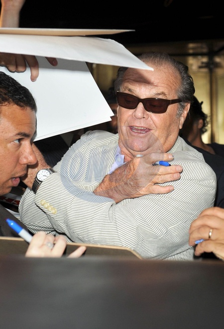 Jack Nicholson rozdaje autografy wychodzac z hotelu w Nowym Jorku