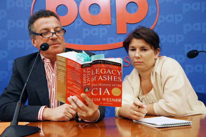 Wizyta w Polsce nowojorskiego reportera i laureata Nagrody Pulitzera, Tima Weinera - autora ksiazki pt. Dziedzictwo popiolow. Historia CIA (Legacy of Ashe. The History of the CIA). Konferencja prasowa w siedzibie PAP w Warszawie