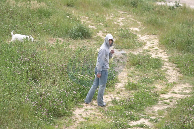spaceruje ze swoim psem Faksikiem na kabatach w poblizu swojego domu