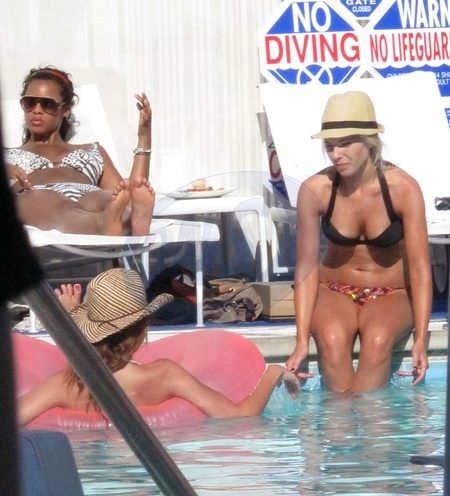 Dziewczyny z The Saturdays popoludniami wypoczywaja na hotelowym basenie, Los Angeles