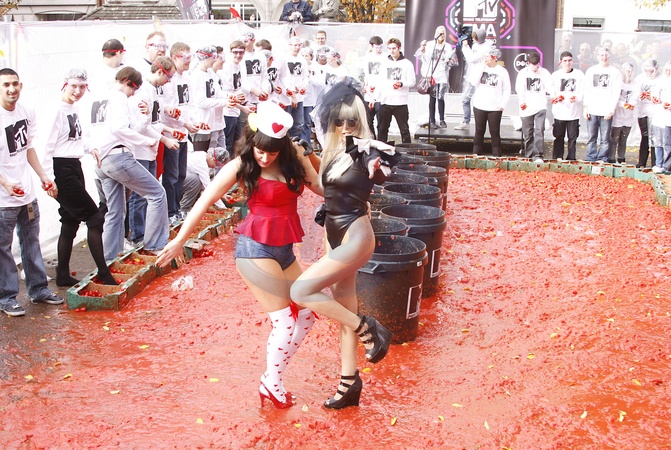 Sobowtory Lady Gagi i Katy Perry walcza w pomidorach, Londyn