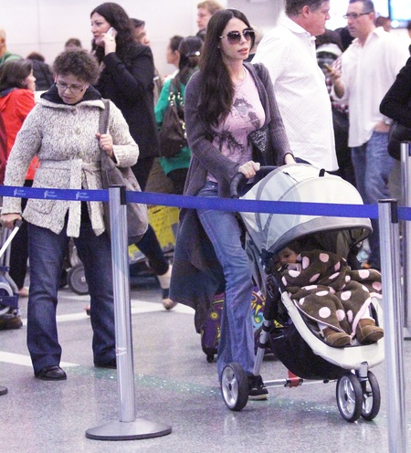 Oksana Grigorieva z corka na lotnisku Lax w Los Angeles