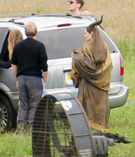 Angelina Jolie w rogach na planie zdjeciowym "Maleficent", Buckinghamshire