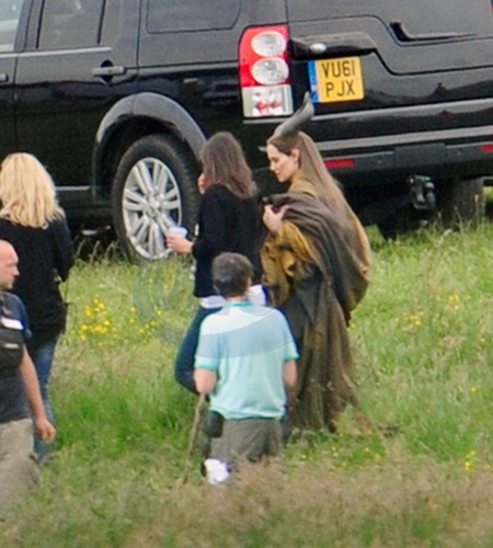 Angelina Jolie w rogach na planie zdjeciowym "Maleficent", Buckinghamshire