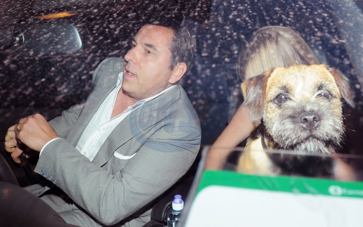 David Walliams i jego zona Lara Stone ida z psem do restauracji, Londyn