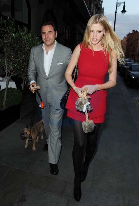 David Walliams i jego zona Lara Stone ida z psem do restauracji, Londyn