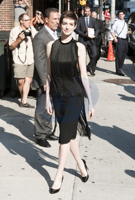 Anne Hathaway przybyla na Late Show w Nowym Jorku