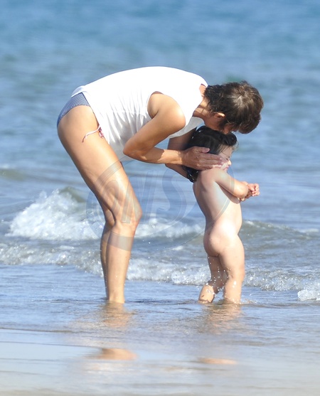 Wloska piosenkarka Gianna Nannini z synem na plazy, Italia