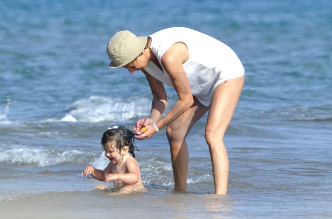Wloska piosenkarka Gianna Nannini z synem na plazy, Italia