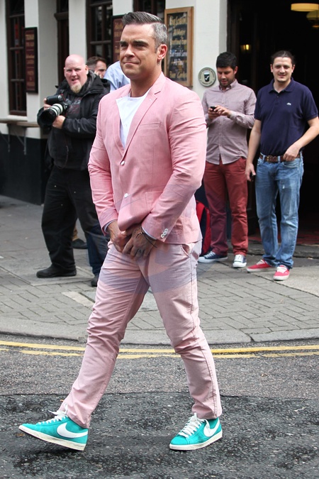Robbie Williams w rozowym garniturze na planie teledysku, Londyn