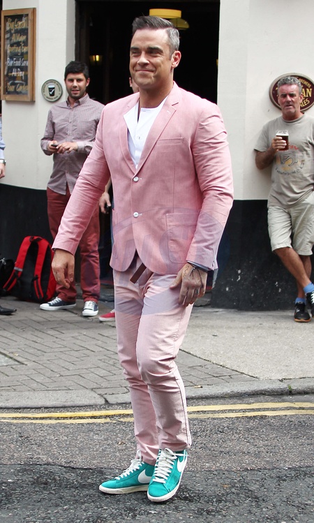 Robbie Williams w rozowym garniturze na planie teledysku, Londyn