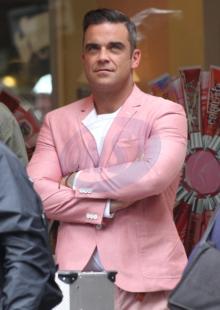 Robbie Williams w rozowym garniturze na planie teledysku, Londyn