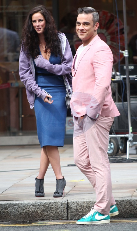 Robbie Williams w rozowym garniturze na planie teledysku, Londyn