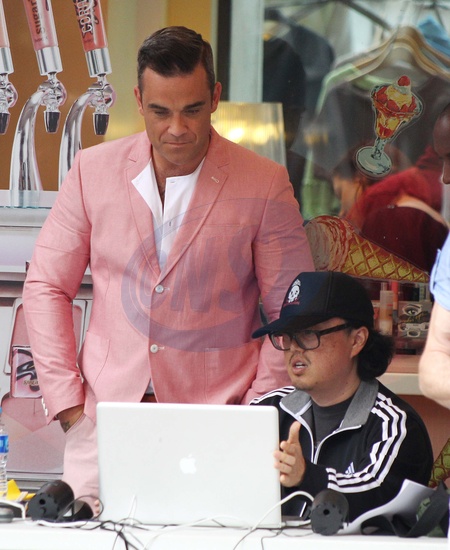 Robbie Williams w rozowym garniturze na planie teledysku, Londyn