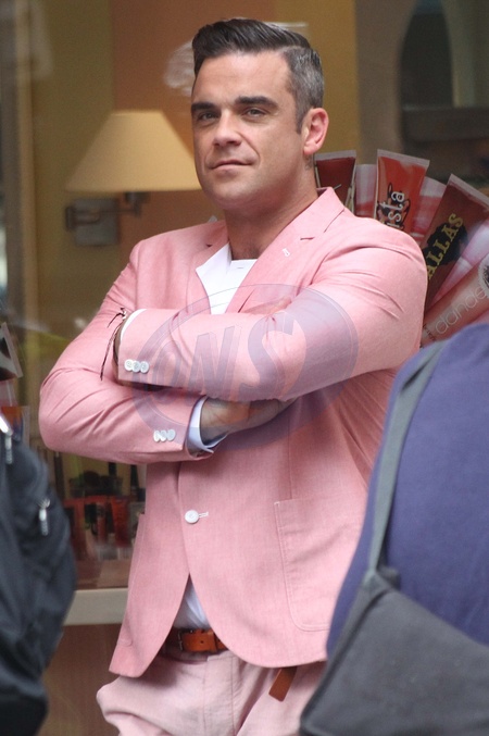 Robbie Williams w rozowym garniturze na planie teledysku, Londyn