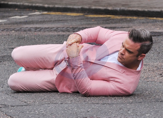 Robbie Williams w rozowym garniturze na planie teledysku, Londyn