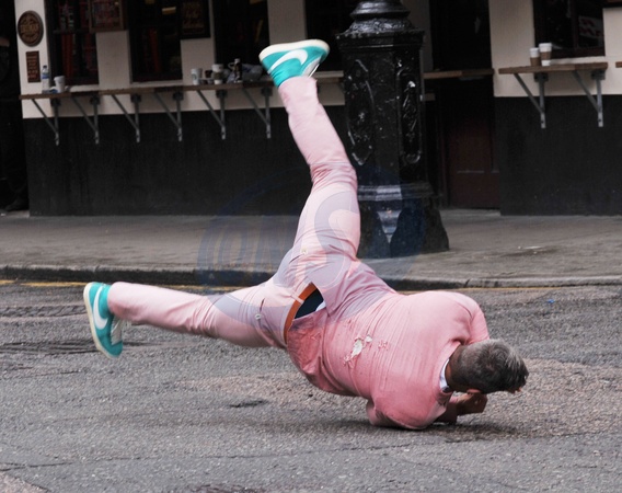 Robbie Williams w rozowym garniturze na planie teledysku, Londyn