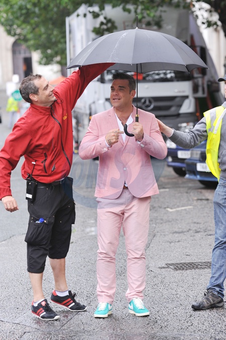 Robbie Williams w rozowym garniturze na planie teledysku, Londyn