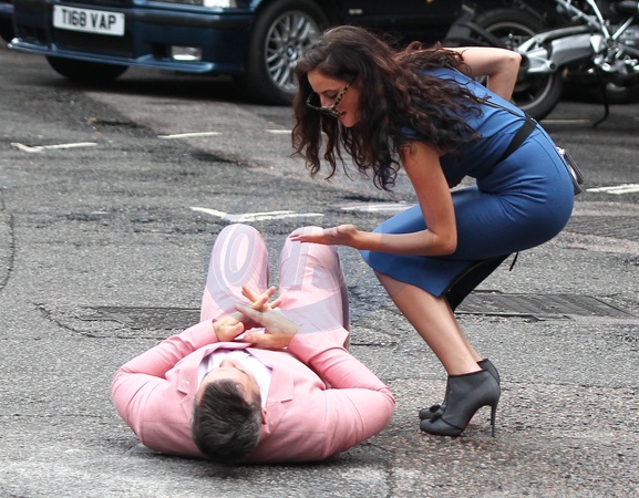 Robbie Williams w rozowym garniturze na planie teledysku, Londyn