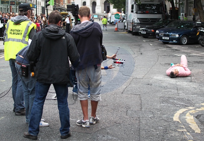 Robbie Williams w rozowym garniturze na planie teledysku, Londyn