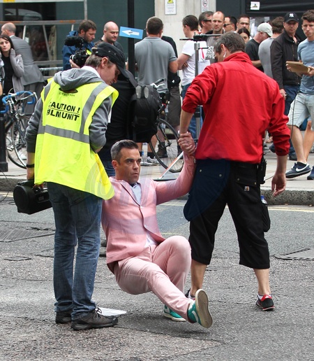 Robbie Williams w rozowym garniturze na planie teledysku, Londyn