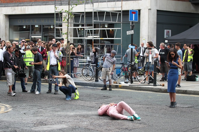 Robbie Williams w rozowym garniturze na planie teledysku, Londyn