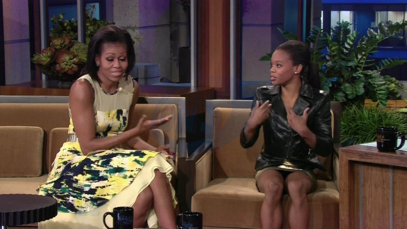 Michelle Obama i zlota medalistka Gabby Douglas w telewizyjnym show, Los Angeles