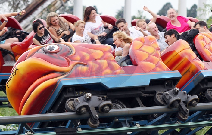 Geri Halliwell z corka w parku rozrywki Thorpe, Londyn