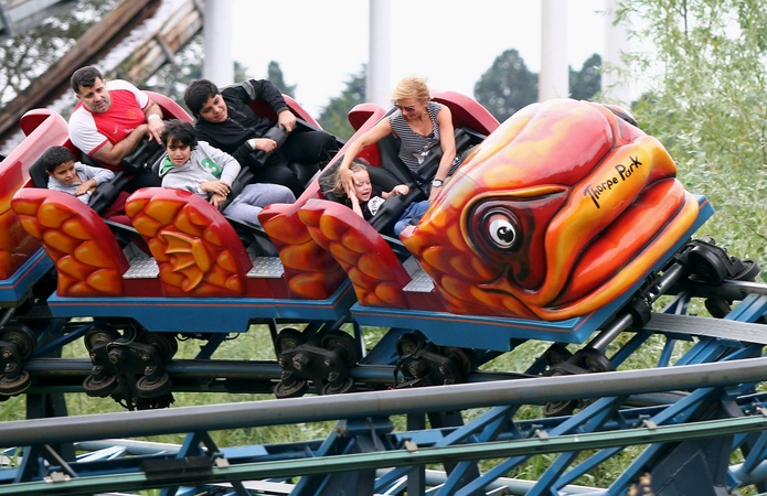 Geri Halliwell z corka w parku rozrywki Thorpe, Londyn