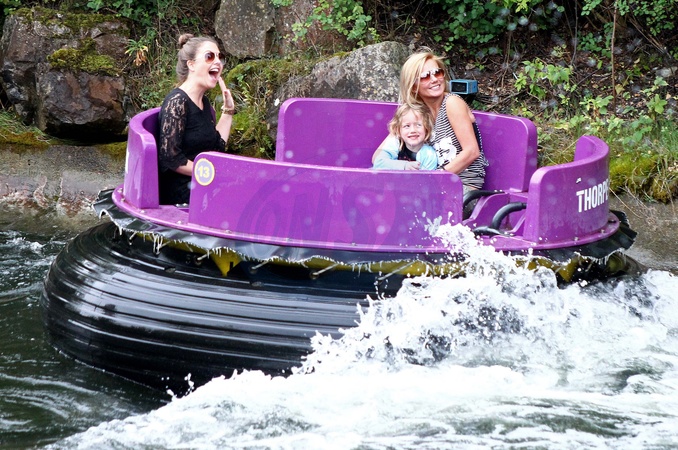 Geri Halliwell z corka w parku rozrywki Thorpe, Londyn